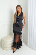 L’Ensemble Ivory Muse réunit structure et légèreté dans une silhouette audacieusement élégante. Le haut façon gilet sans manches, rehaussé de boutons dorés, offre une allure couture tout en soulignant la taille. La jupe longue, sublimée par un jeu de transparence et de volants en tulle, crée un contraste aérien qui attire tous les regards. Avec ses textures nobles et sa coupe affirmée, cet ensemble est idéal pour une occasion chic, une soirée ou une apparition remarquée.