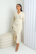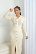 Une robe qui allie élégance et caractère. Confectionnée en maille raffinée, elle séduit par sa coupe ajustée et ses boutons dorés qui illuminent la silhouette. Ses poches décoratives et son col chemise ajoutent une touche chic et structurée, parfaite pour un look sophistiqué de jour comme de nuit.