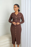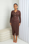 Une robe qui allie élégance et caractère. Confectionnée en maille raffinée, elle séduit par sa coupe ajustée et ses boutons dorés qui illuminent la silhouette. Ses poches décoratives et son col chemise ajoutent une touche chic et structurée, parfaite pour un look sophistiqué de jour comme de nuit.