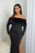 Avec son col bardot orné d’une douce bande en fausse fourrure, elle sublime les épaules tout en apportant une touche de chaleur et de raffinement. Sa coupe près du corps, fendue sur la jambe, crée une allure sensuelle et sophistiquée, parfaite pour les soirées ou les grands événements.