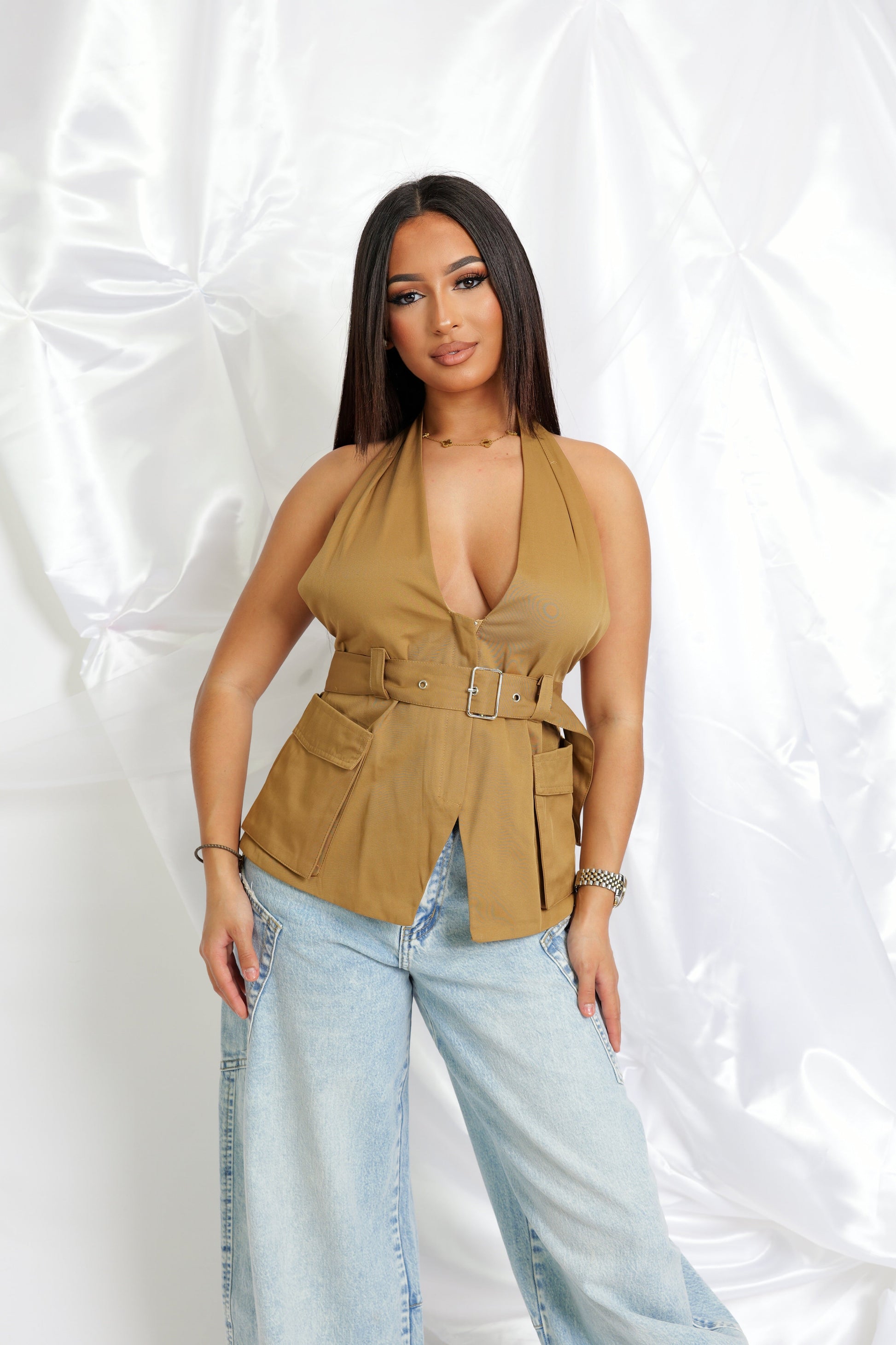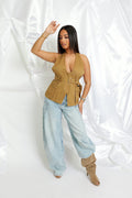 Directement inspiré de la tendance année 2000, le Top Millenium Babe incarne l’audace et la féminité assumée. Sa coupe halter met en valeur les épaules tandis que son décolleté plongeant sublime la silhouette avec élégance.